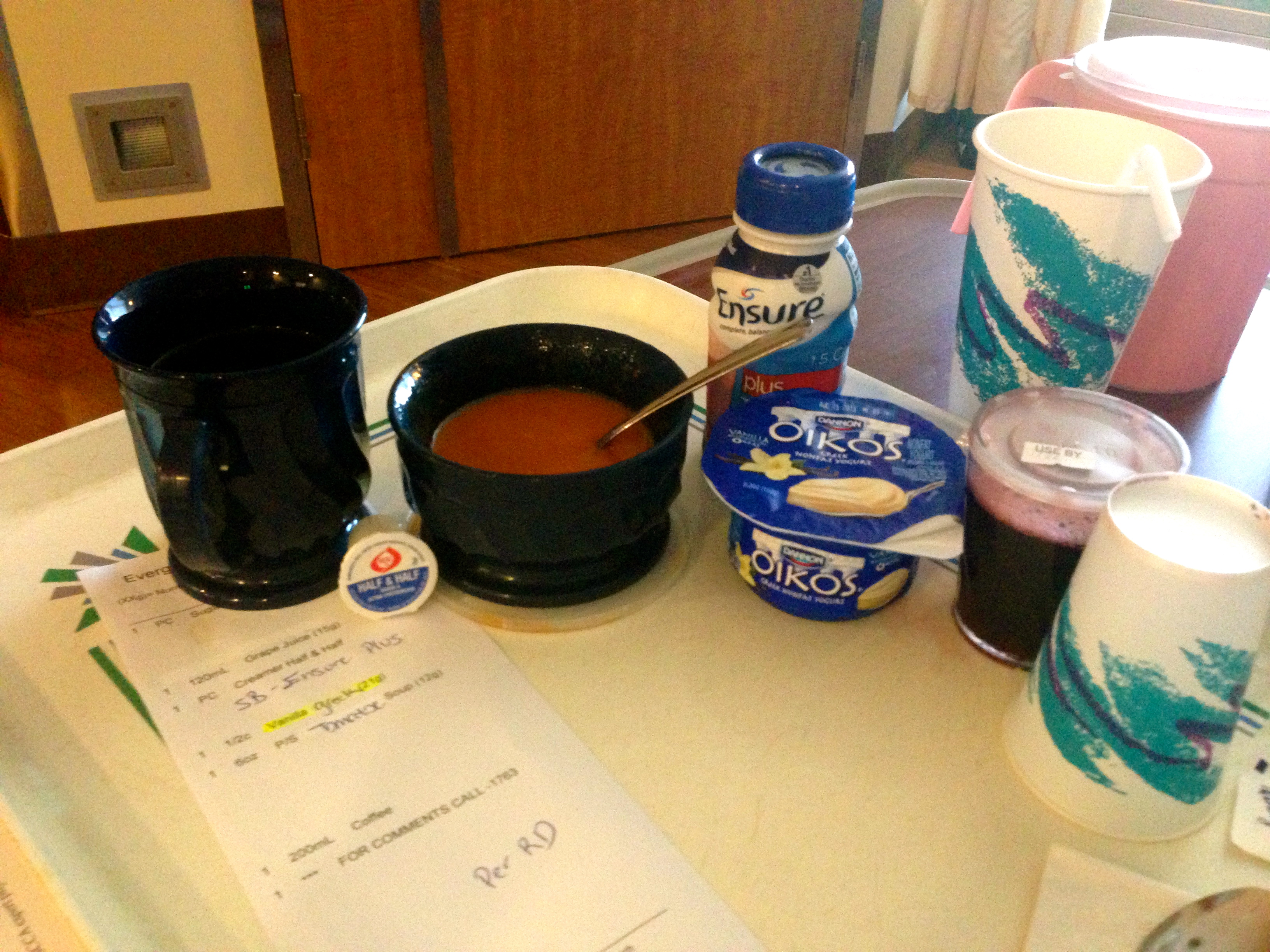 So I’m on a strict liquid diet, given that I’ve been having a lot of stomach pains. The tomato soup is the best soup the hospital has to offer (no joke) as well as the jello. The ensure was not that bad, it’s quite filling. Yet on the other hand, the Oikos Greek yogurt was disgusting.