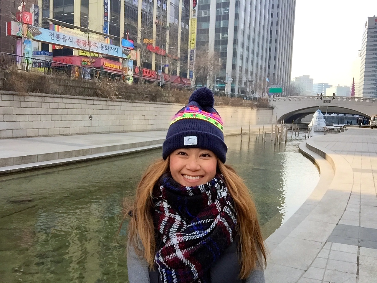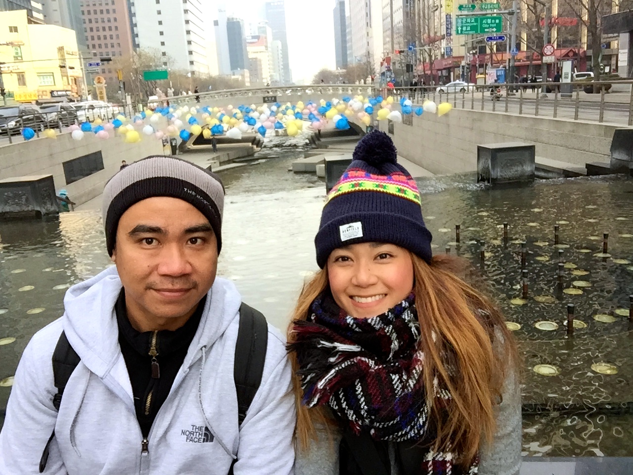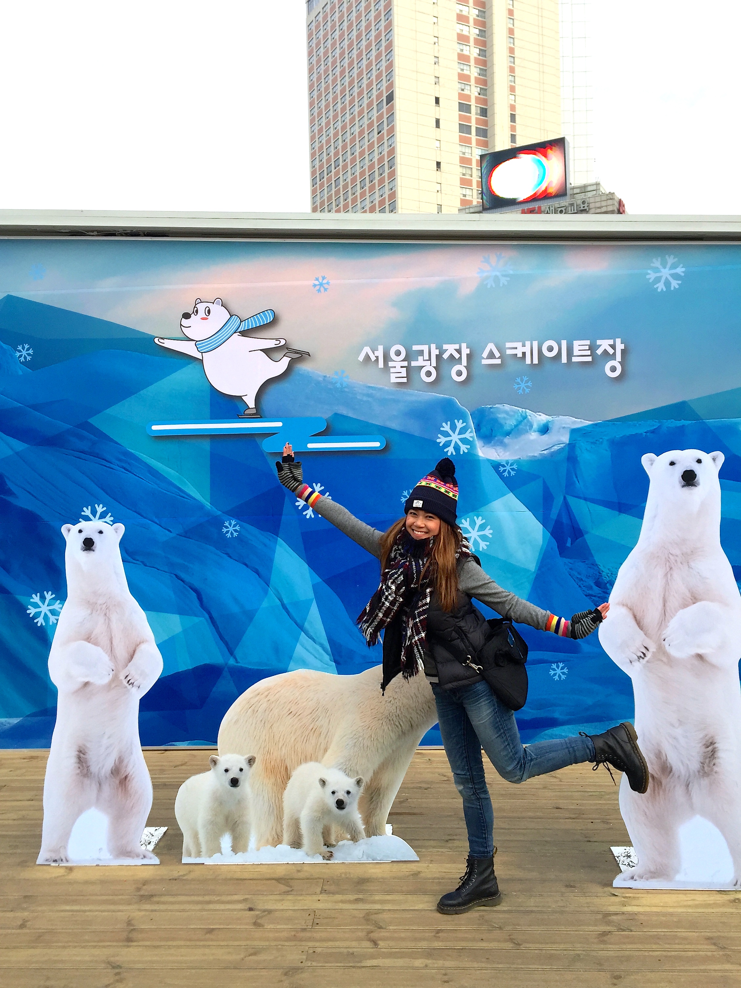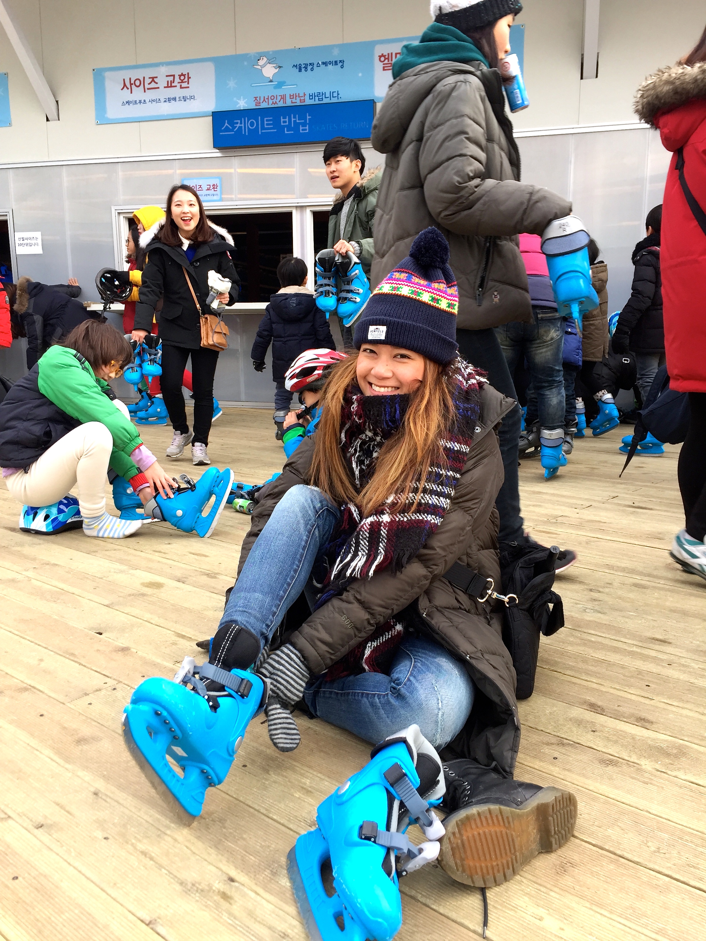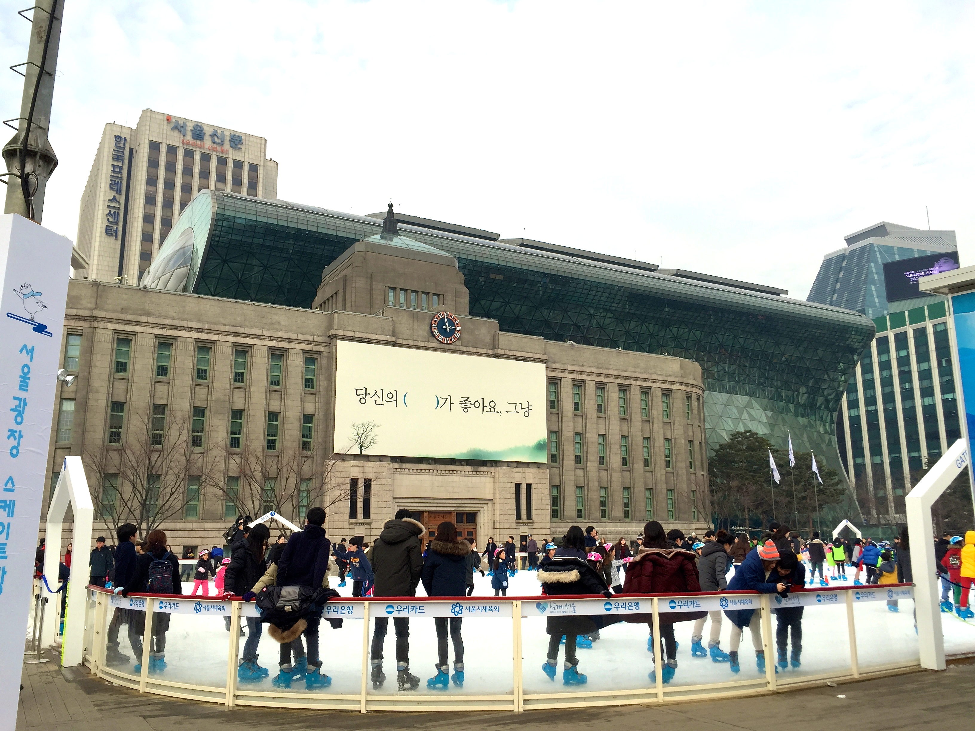 We stumble upon this outdoor ice skating rink while on our way to Cheonggyecheon Stream. It cost only 1,000 Korean won ($1.00 USD) per person for an hour session which includes skates! We figure for that price, why not give it a go! I have only ice skated once before in my life – a loooooooong time ago. Ice skating is not easy – it’s quite challenging; plus my skates was digging into my ankles making it pretty hard to skate around. After a couple of rounds, I started getting the hang of it and it actually became fun and less frustrating.