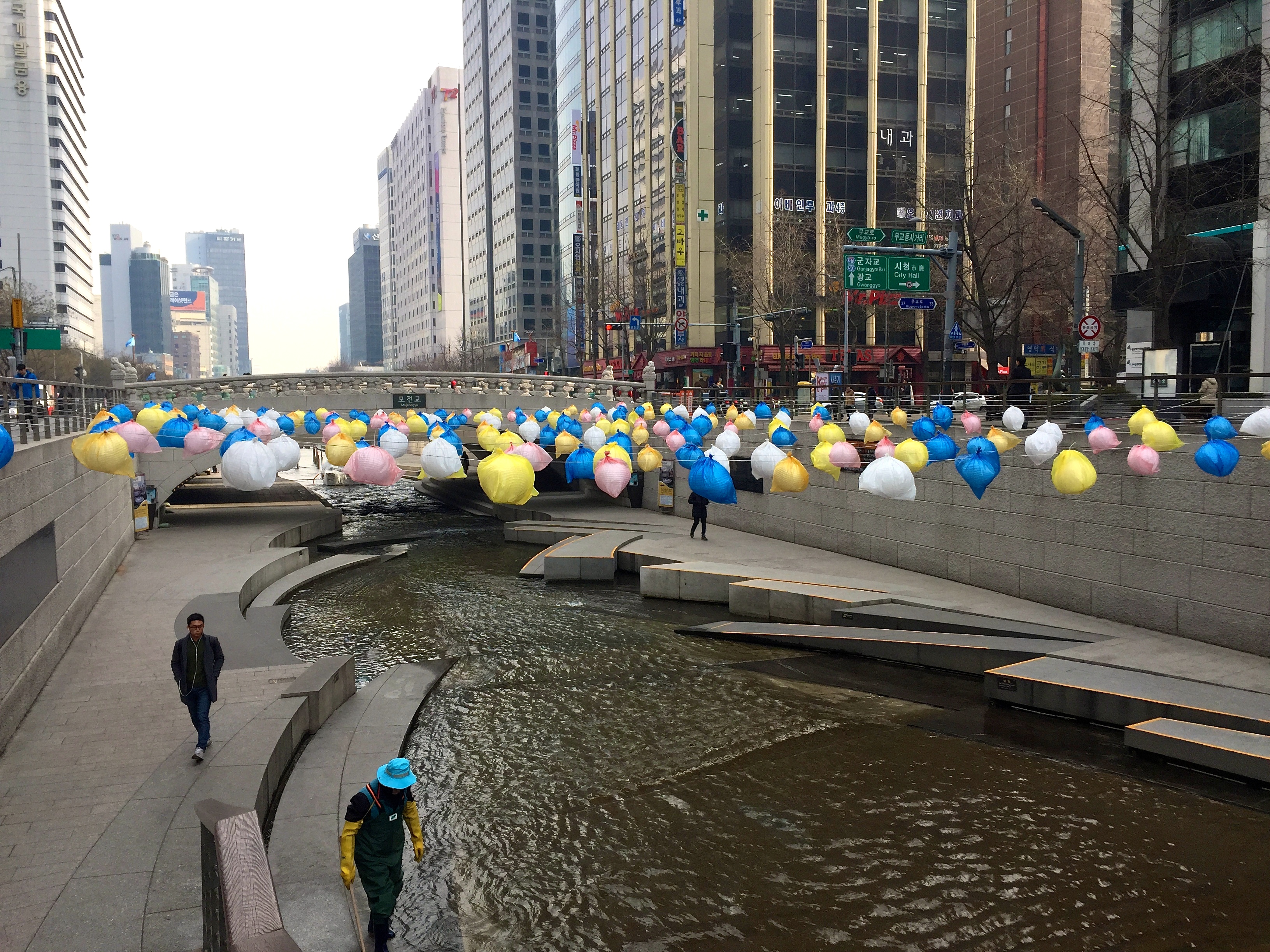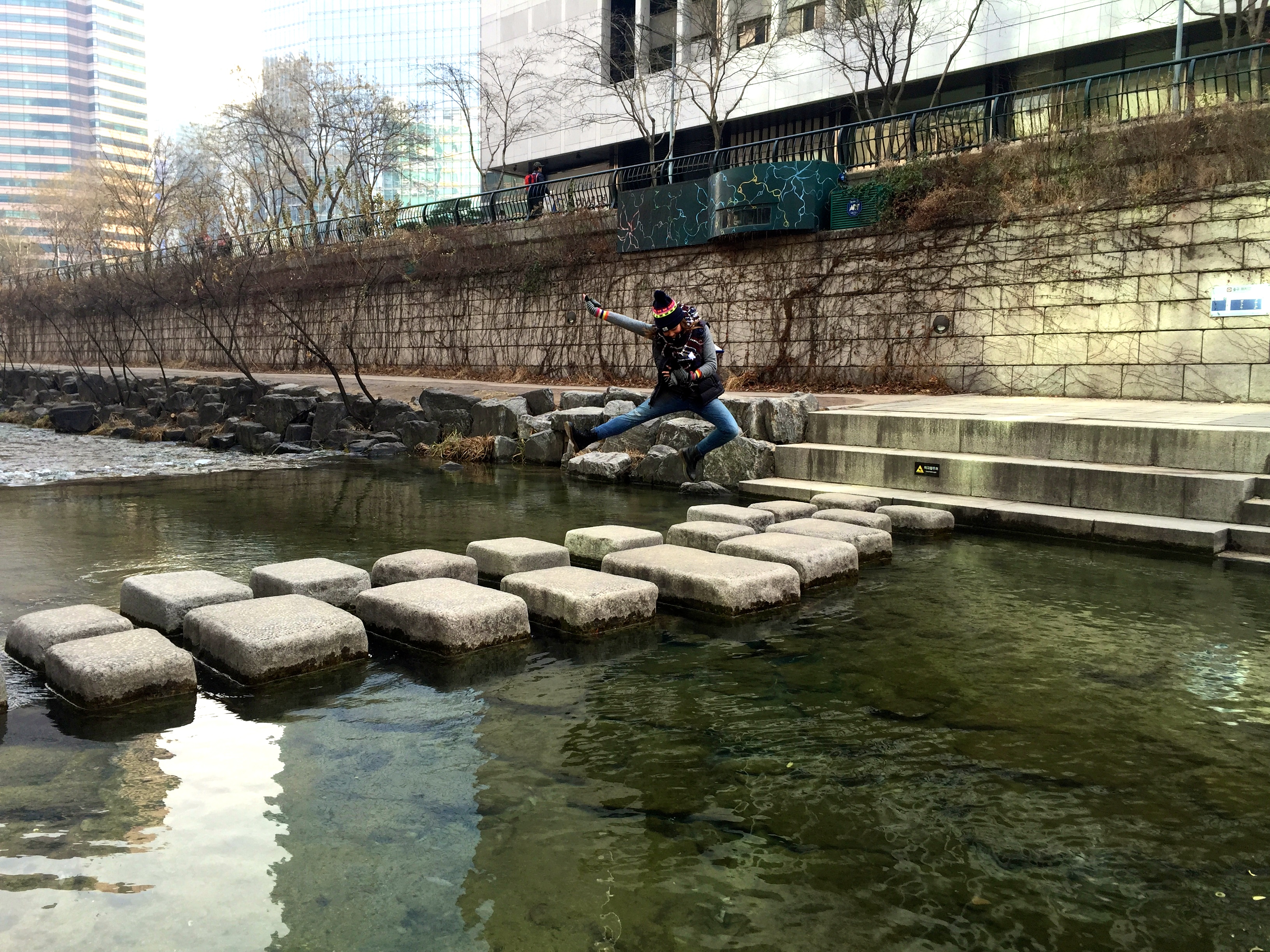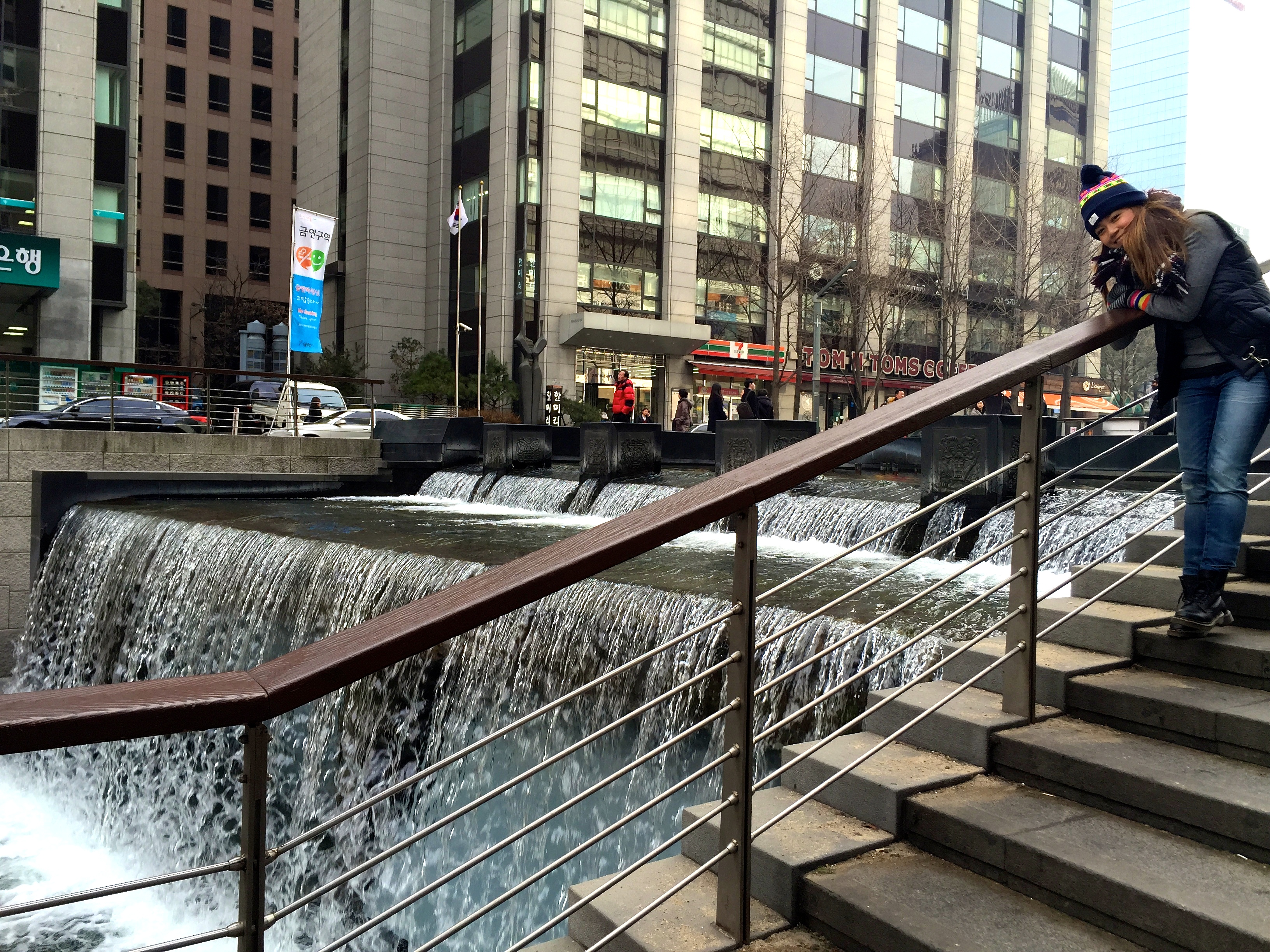 We started at the starting point of the stream at Cheonggye Plaza. Stepping down to the stream there are candlelight fountains illuminated by different colored lights, and the four meter high waterfall, which I read is absolutely gorgeous at night when it’s all lit up. The water begins to flow through here towards Hangang River.