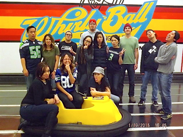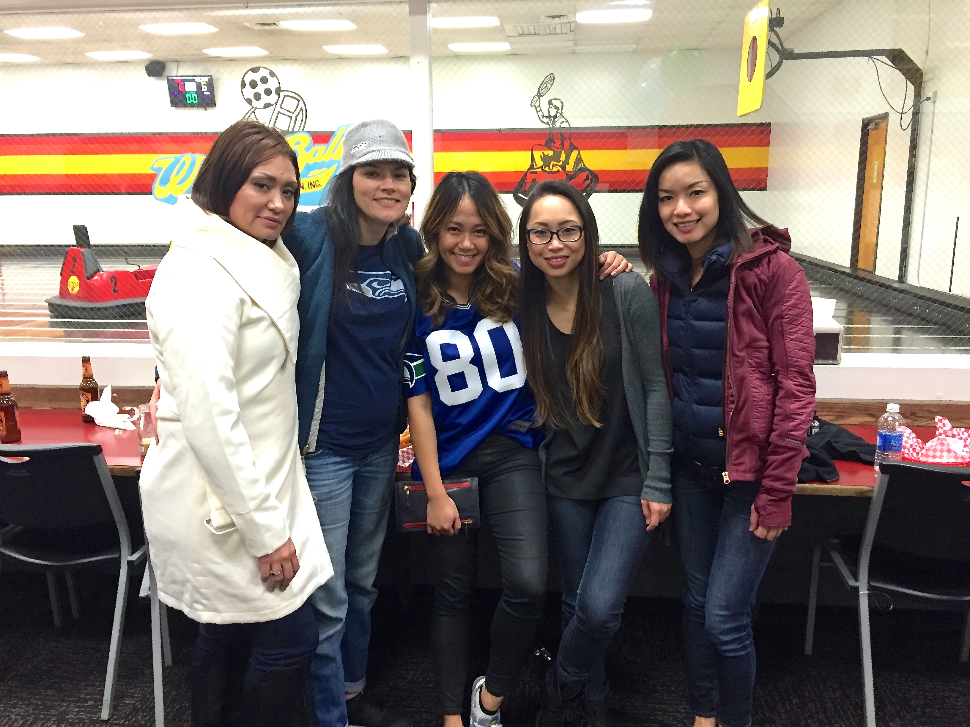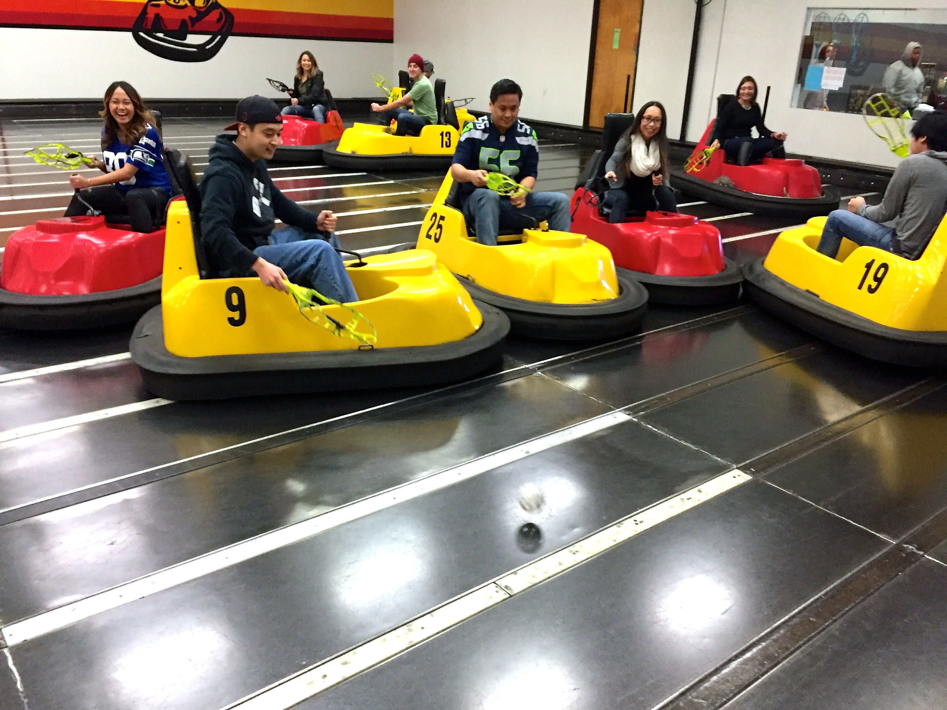 Driving, crashing into bumper cars, and whipping a ball around at your friends…how much better can my birthday party be?!? It’s two teams of 5 scooting around on a court with a ball you’re trying to throw at a target. We started off with guys vs. girls and we pretty much got our asses kick (guys are just better “team” players). Whirlyball is a bit harder than it looks, but once you get the steering down it is so much fun. We all ended up with bruised knees while a few of us had some neck injuries due to the repeated whiplash – sorry guys!
