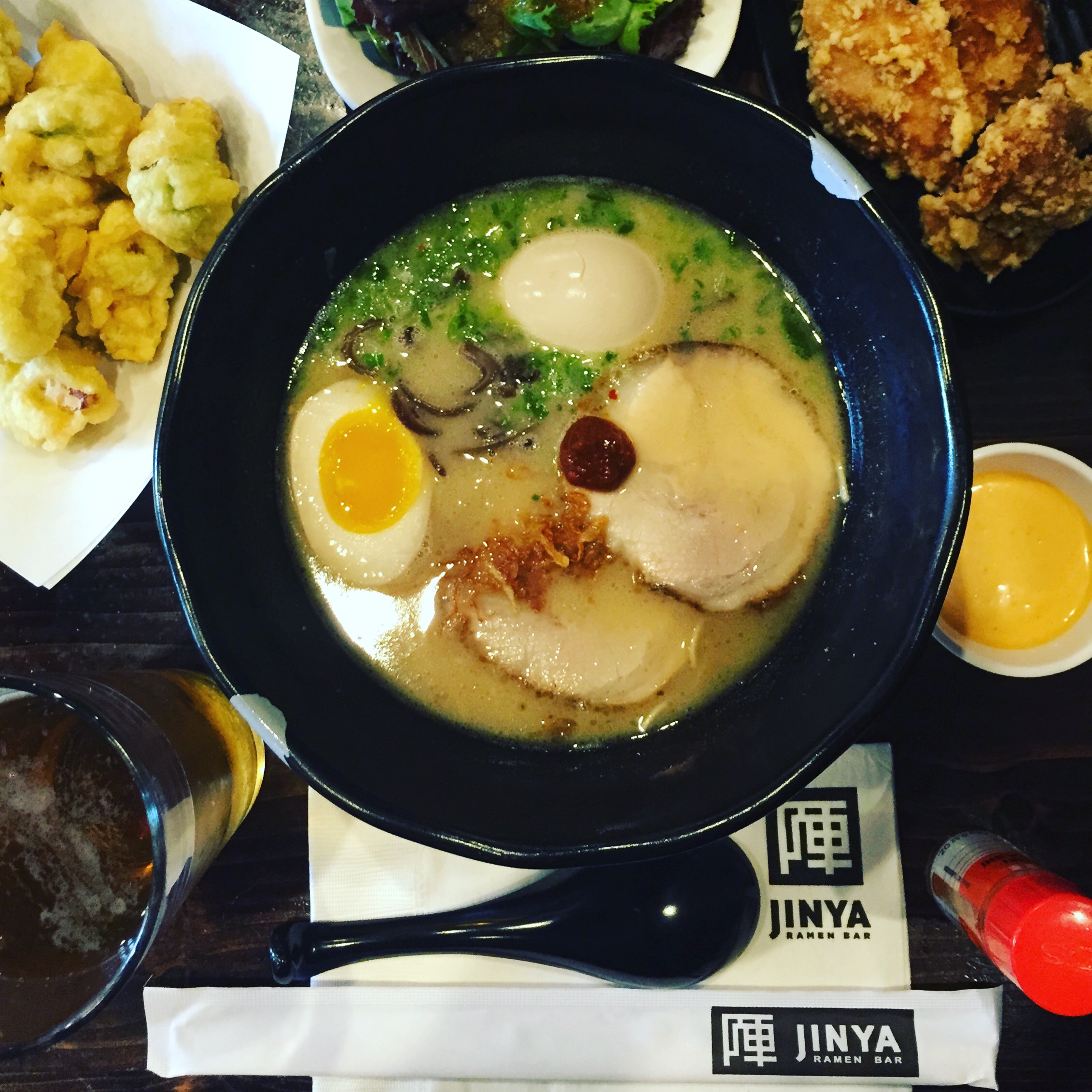 I had a combination meal: which includes a ramen, salad with a sort of miso flavor dressing, and chicken karaage which was amazing. For the ramen: I ordered the Premium Tonkotsu White. The pork and chicken broth was rich and flavorful, the thin noodles was a great texture of soft and chewy, and the pork chashu was more on the fatty side but still tender and delicious! As for the seasoned egg, it was PERFECT! You MUST order the brussel sprouts tempura with truffle essence and wash it all down with a nice cold glass of Sapparo!