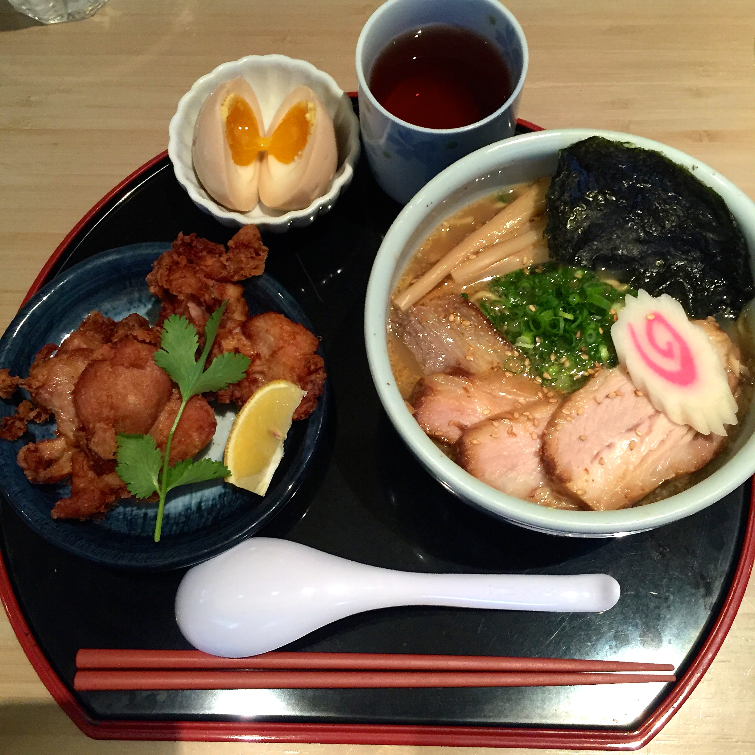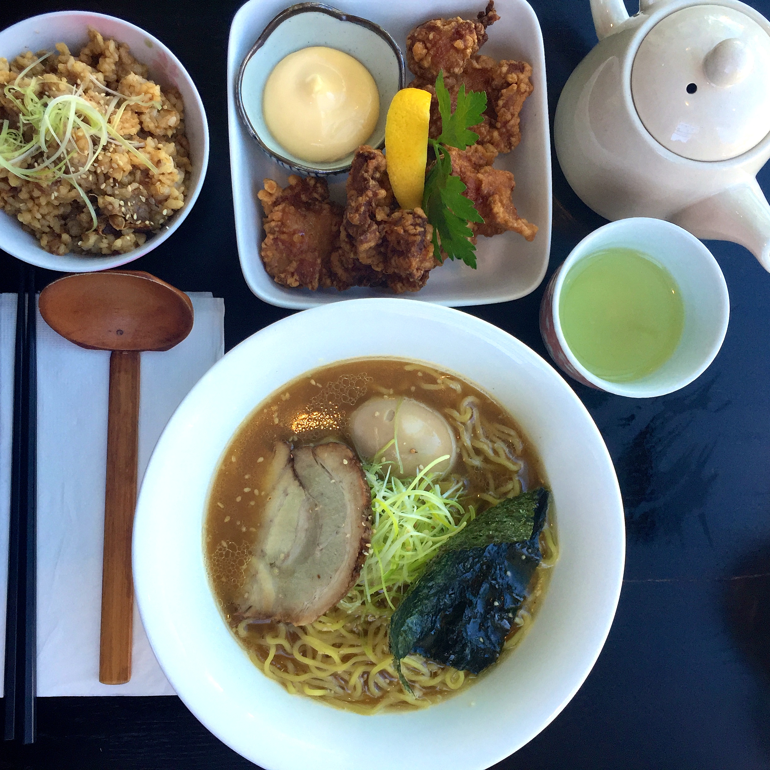 My meal consisted of zangi, Yoroshiku’s version of Japanese fried chicken strips we normally recognize as chicken karaage. The thin batter coating fried in a light oil was delightfully tasty with the chili sauce. I followed that up with Shoyu Ramen and added a soft-boiled egg to mix in with the bamboo shoots, green onions, bean sprouts and the one slice of pork included in my ramen. I also ordered the cha shu donburi which was just okay. The ramen is where it’s at! The soup was flavorful and true to its description — chicken and fish broth seasoned with soy sauce!