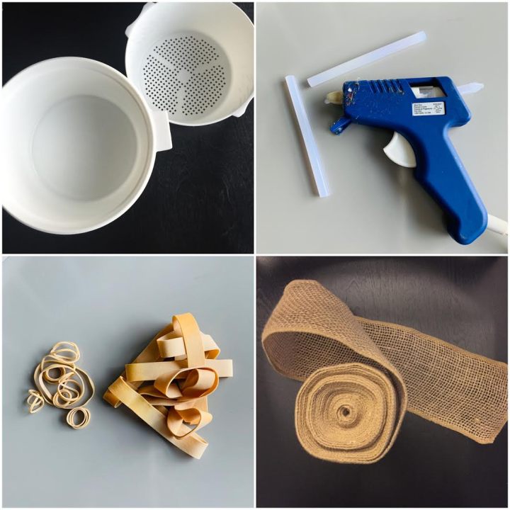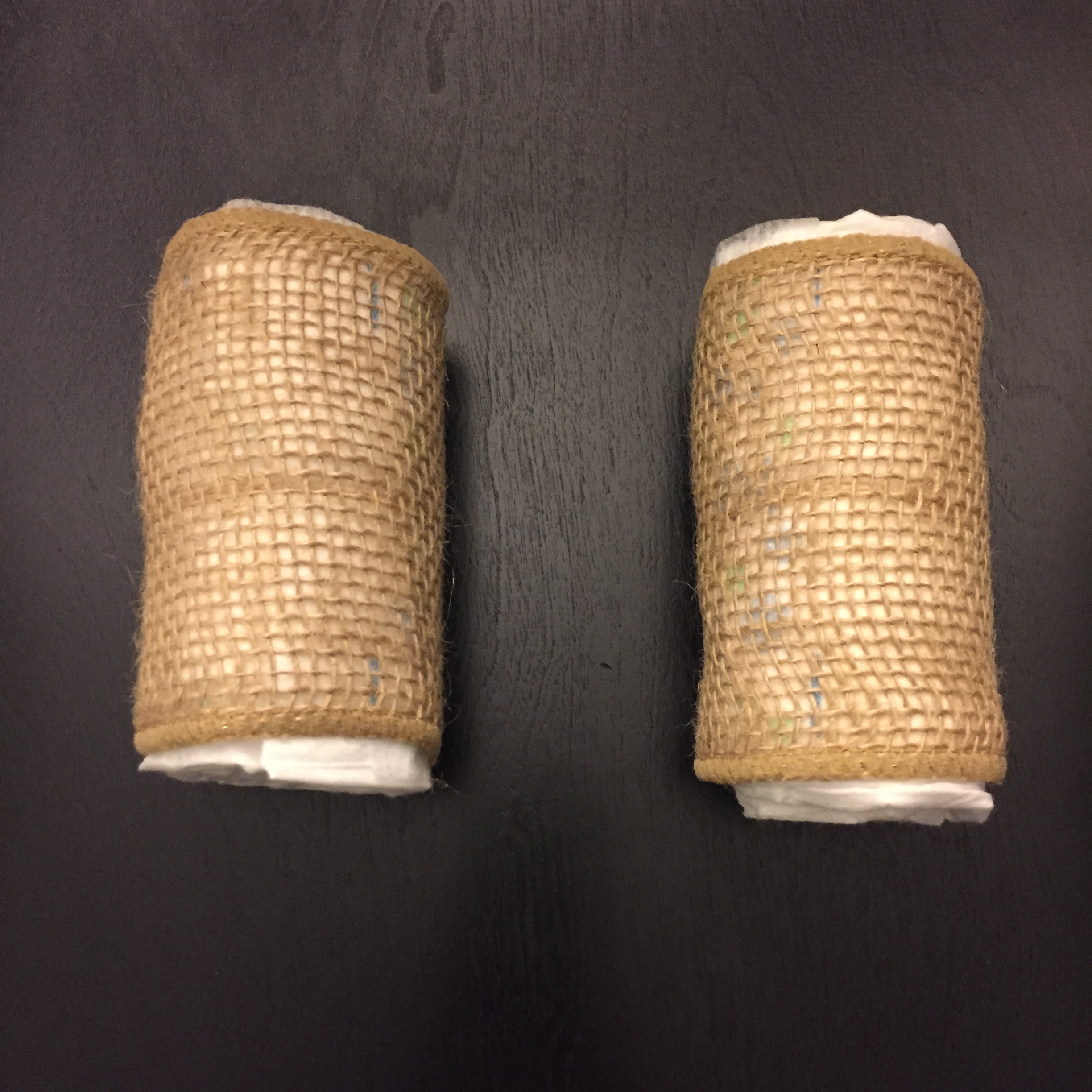 After filling the containers with the diapers laying out flat, you remove the container and secure it with the thick rubber bands. Wrap the brown ribbon on each wheel by using the hot glue gun to hold it together.
