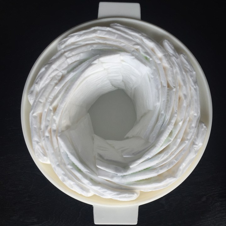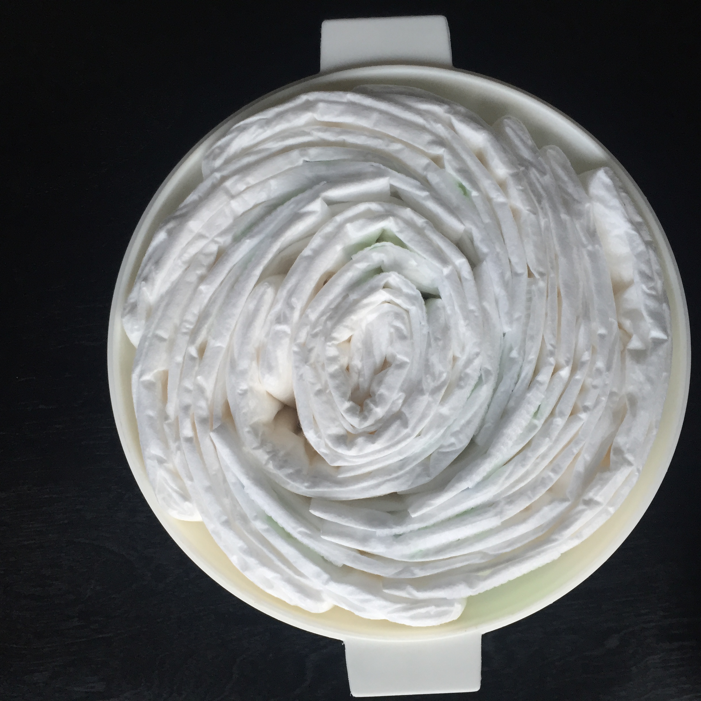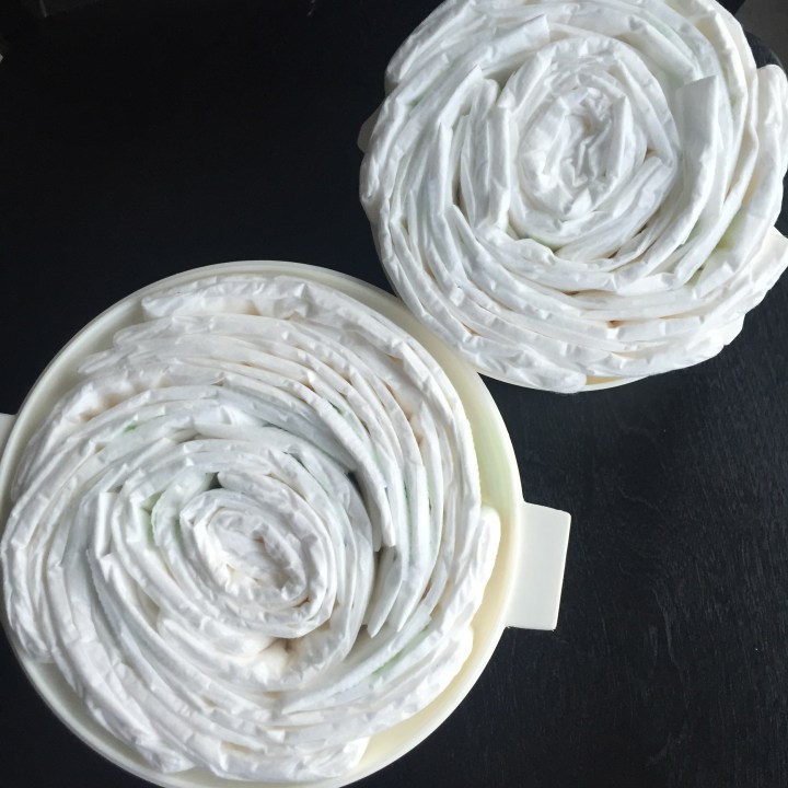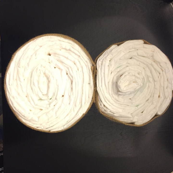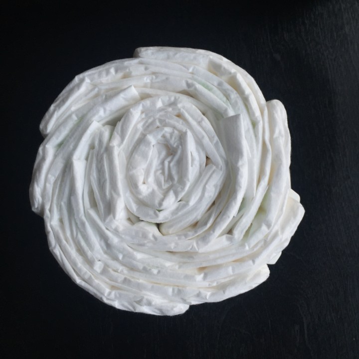 First thing you need to do is create two wrapped diaper wheels. One wheel should roughly have 7 – 10 diapers, this is the bear’s face. The other wheel should contain 15 – 20 diapers, this is the bear’s body.You should have six extra diapers for the bears ears, nose & feet, more on that later.