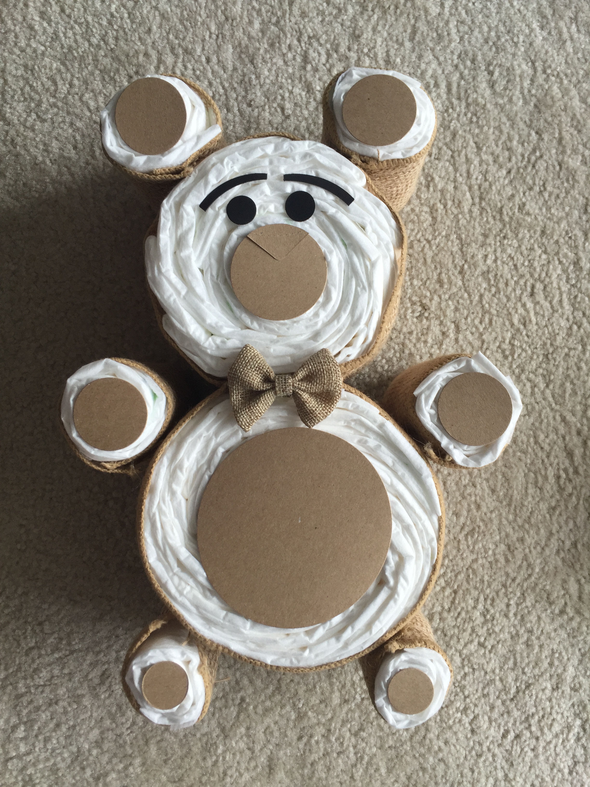 Roll up 6 diapers and put small rubber bands on them tight. Wrap them in the brown ribbon and glue them onto the bear for his ears, hands & feet.