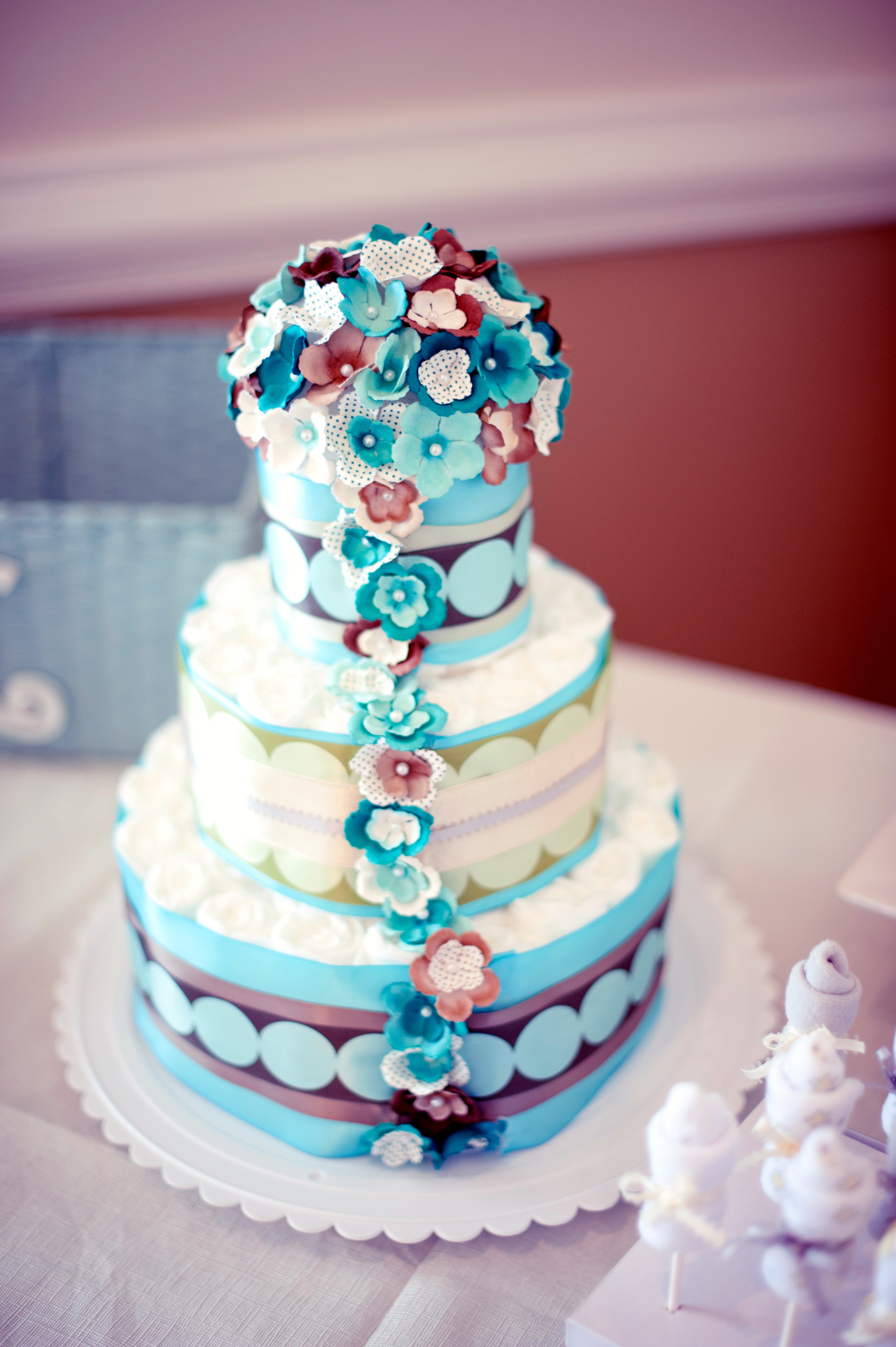 My inspiration comes from the theme of the shower and the expecting mommies. I mainly use fabrics and ribbons, I’ve never been one to add baby items – such as bottles, pacifiers, or toys, I feel like these items take away from the design of the cake which tends to look really busy and messy.