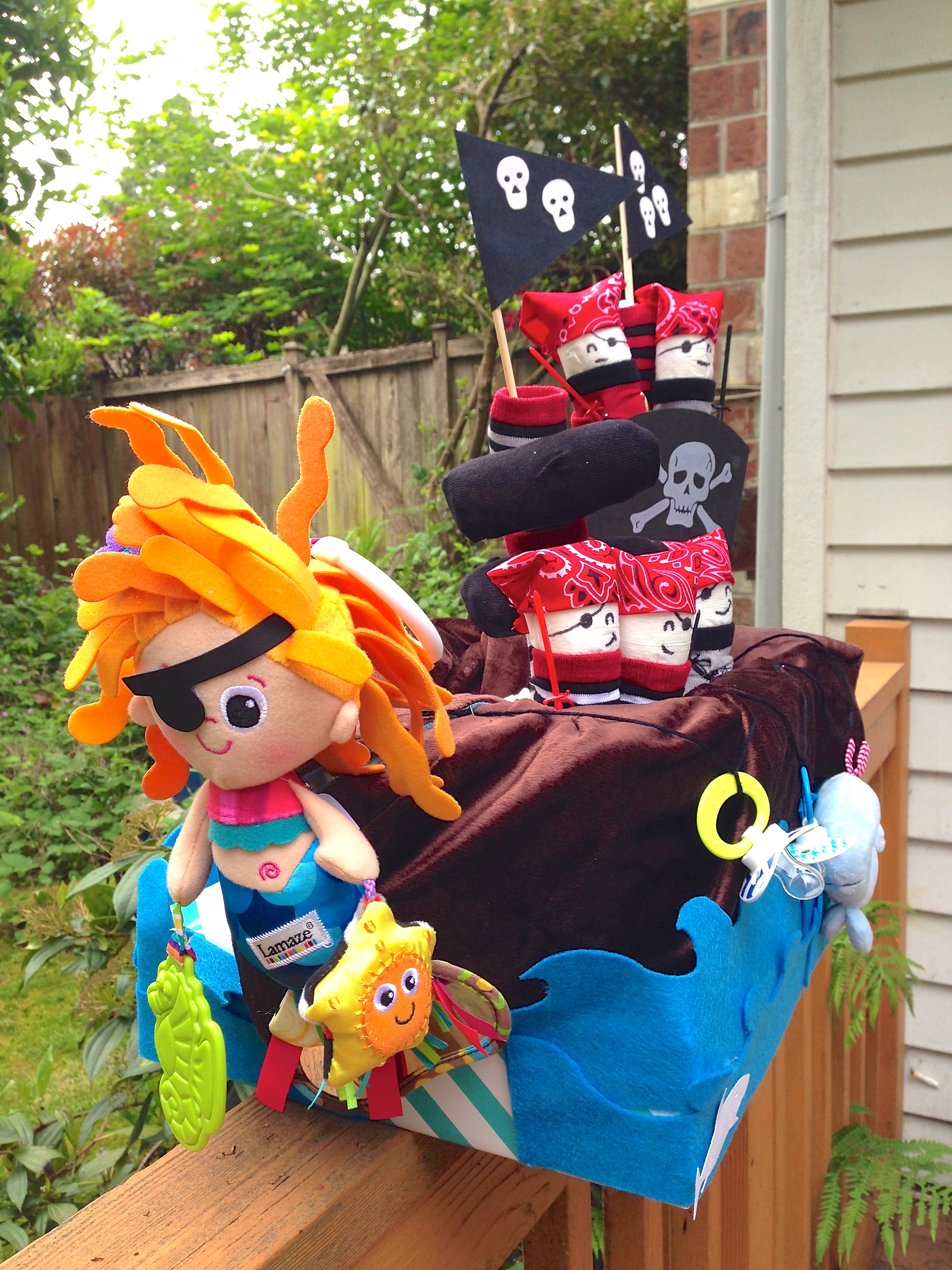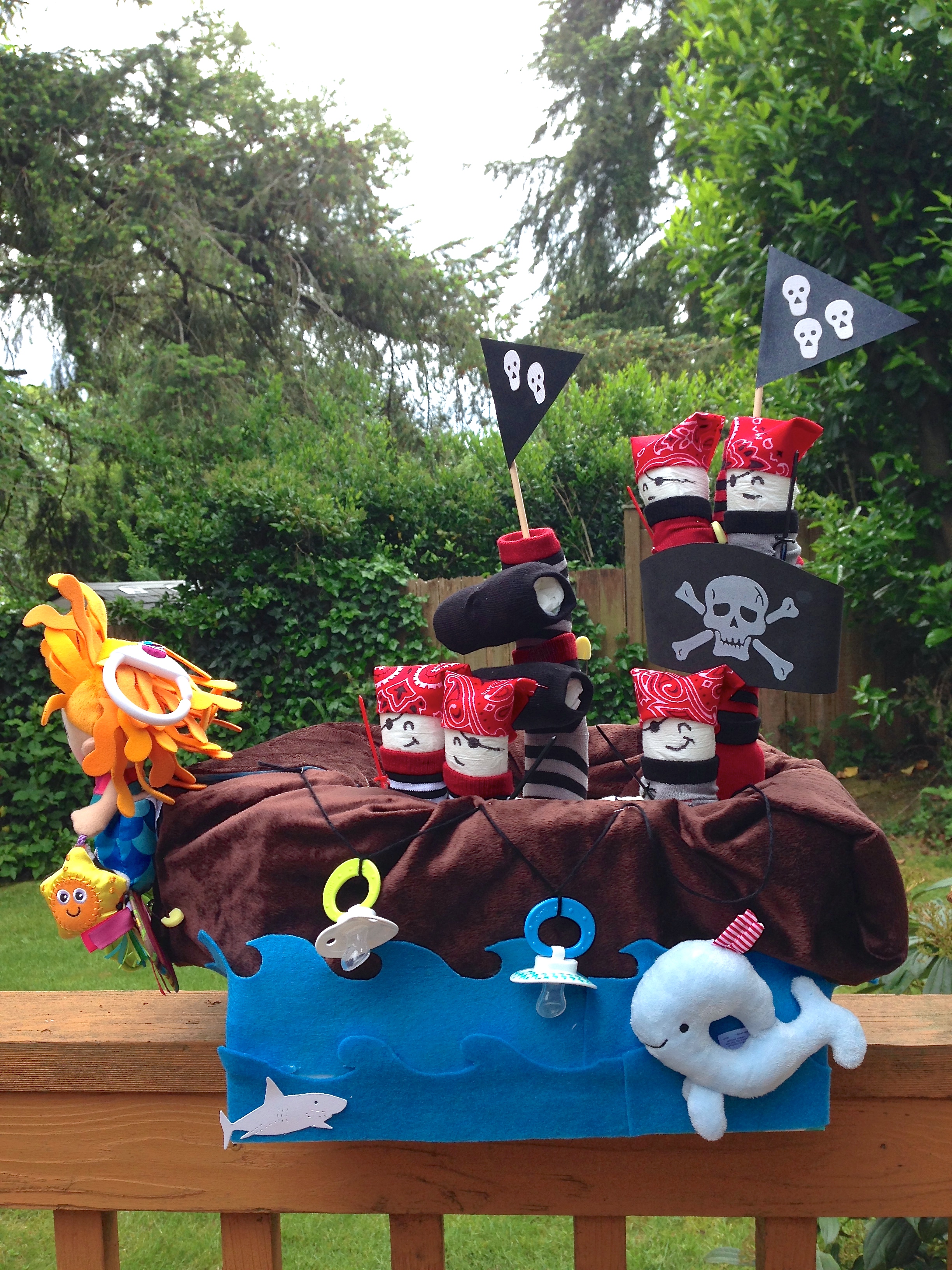 ARGH!!! This one was a toughie!!! I didn’t really know what I was doing, I just knew that I wanted a pirate ship with little pirate diapers holding swords and tada – this happened!