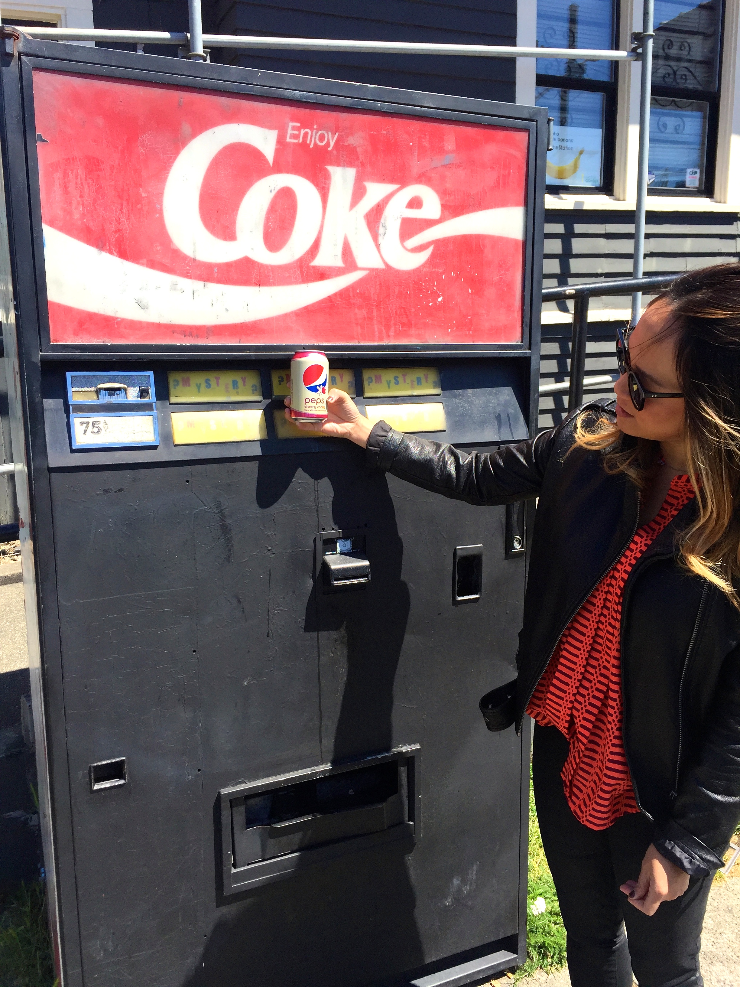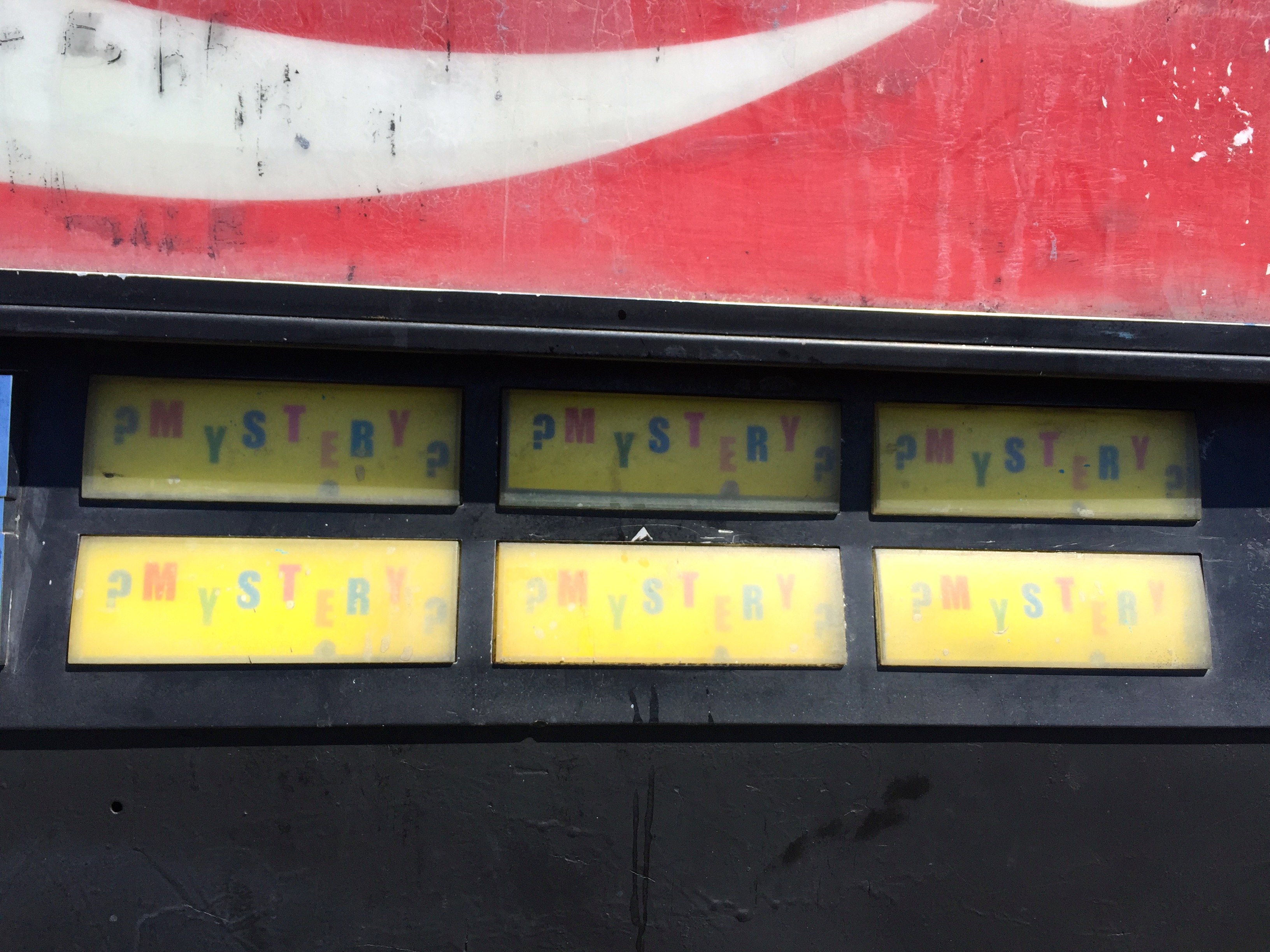 All six buttons are labeled “mystery.” On my recent trip, I plunked down $.75 (cause that’s was all that I had on me) for a Pepsi Cherry Vanilla which tasted just okay!