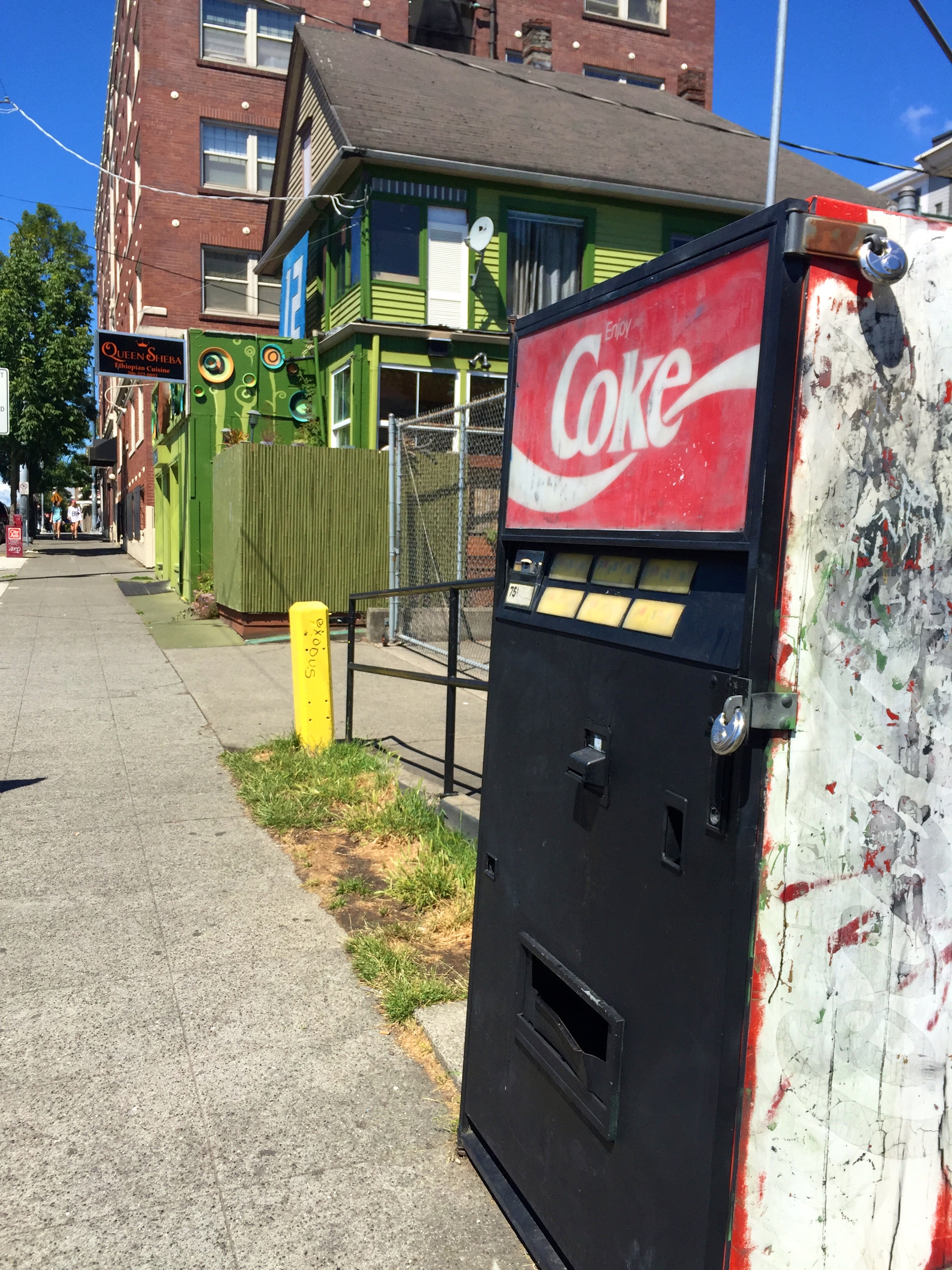 It’s within earshot of the neighborhood’s new light-rail station and Broadway’s posh eateries and shops, right in front of a locksmith business at East John Street and 10th Avenue East. The graffiti-covered soda-pop dispenser has been reportedly spitting out cans of “mystery” soda for decades — right now, for a retro price of 75 cents a pop.