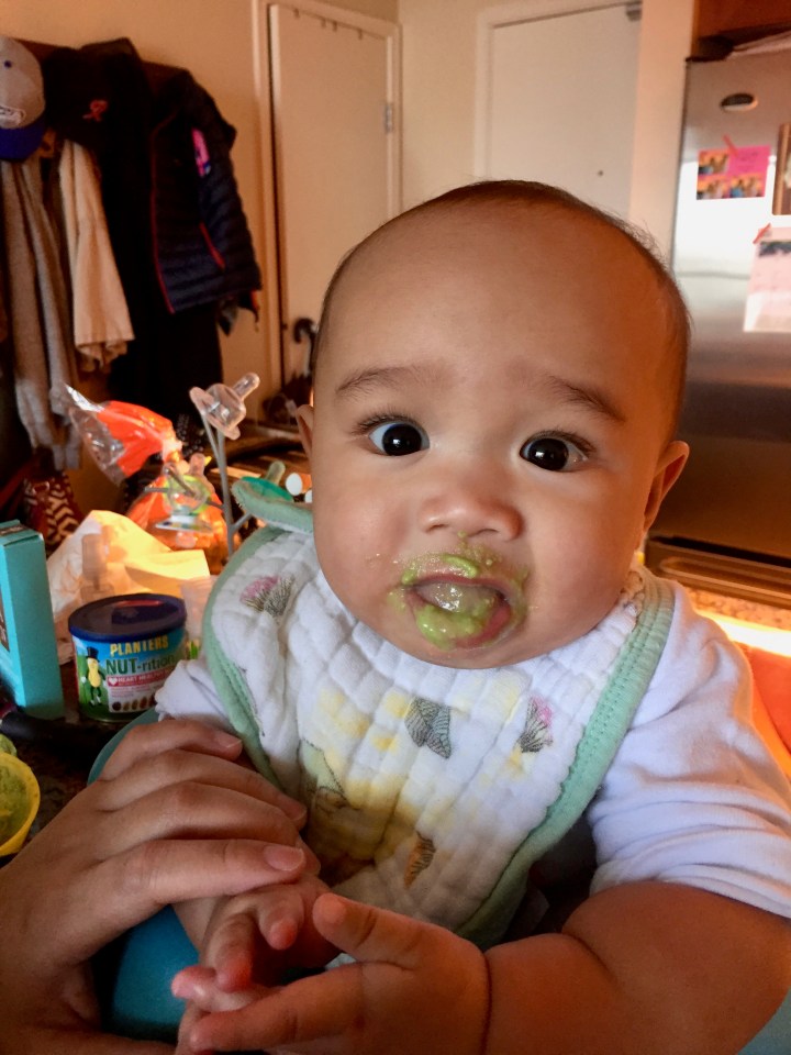 We were given the OK to start with solids at our 4 month checkup but we actually didn’t start giving him anything till about 5 months. We started off slowly with just rice cereal and oatmeal. Then we proceeded to sweet potato which is lovvvves and carrots which he was not a big fan…lol! On his big half birthday, we made him try avocado! Will be experimenting with more foods – so stay tuned!