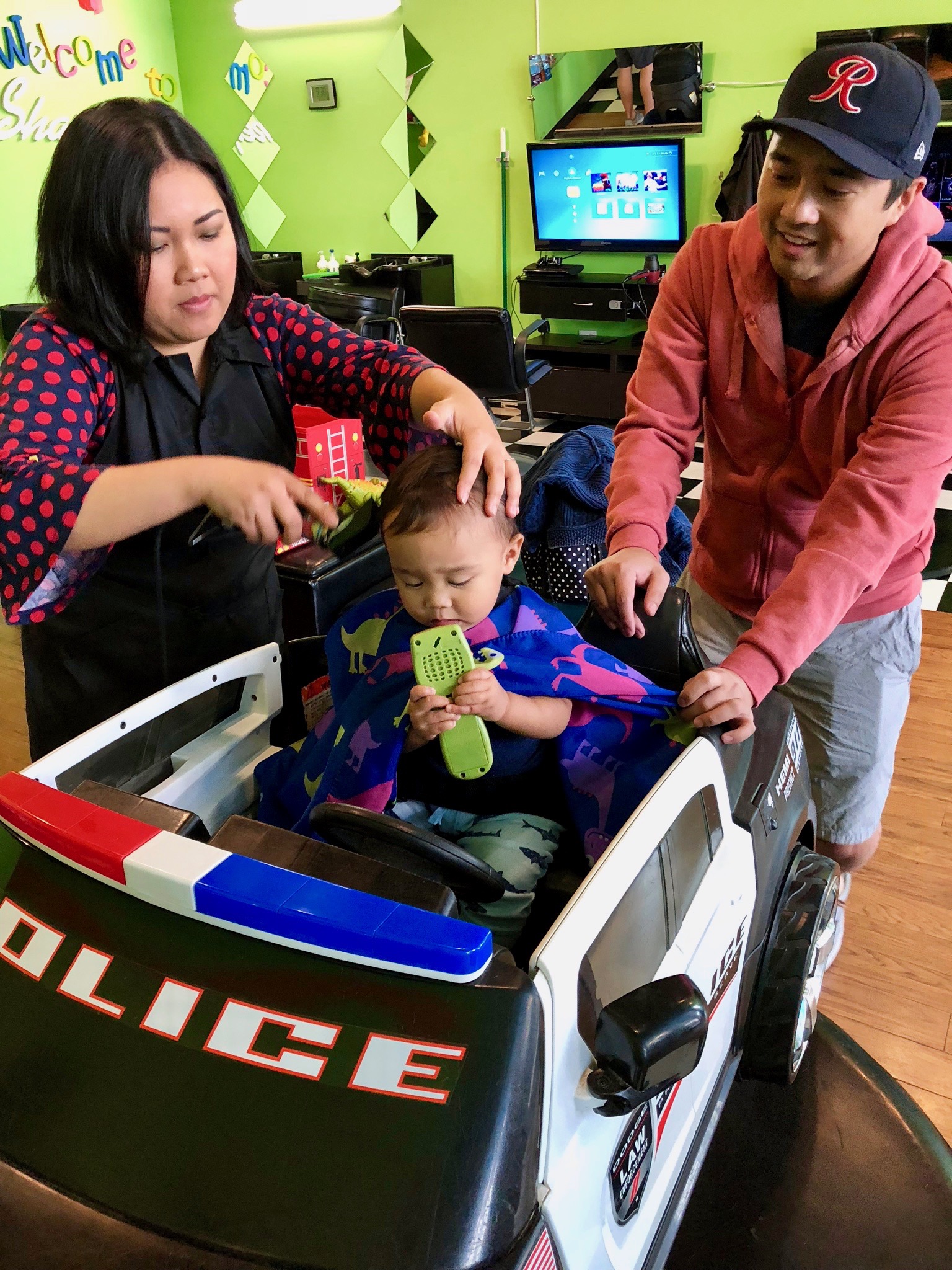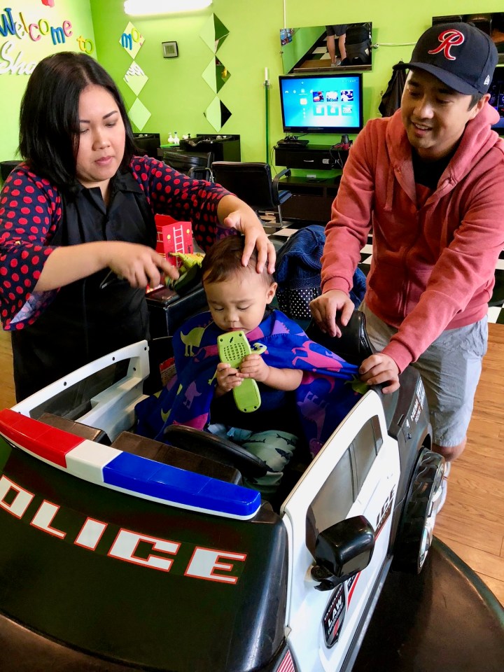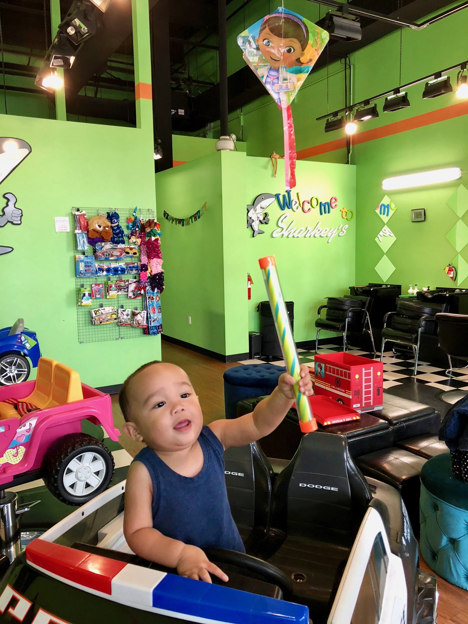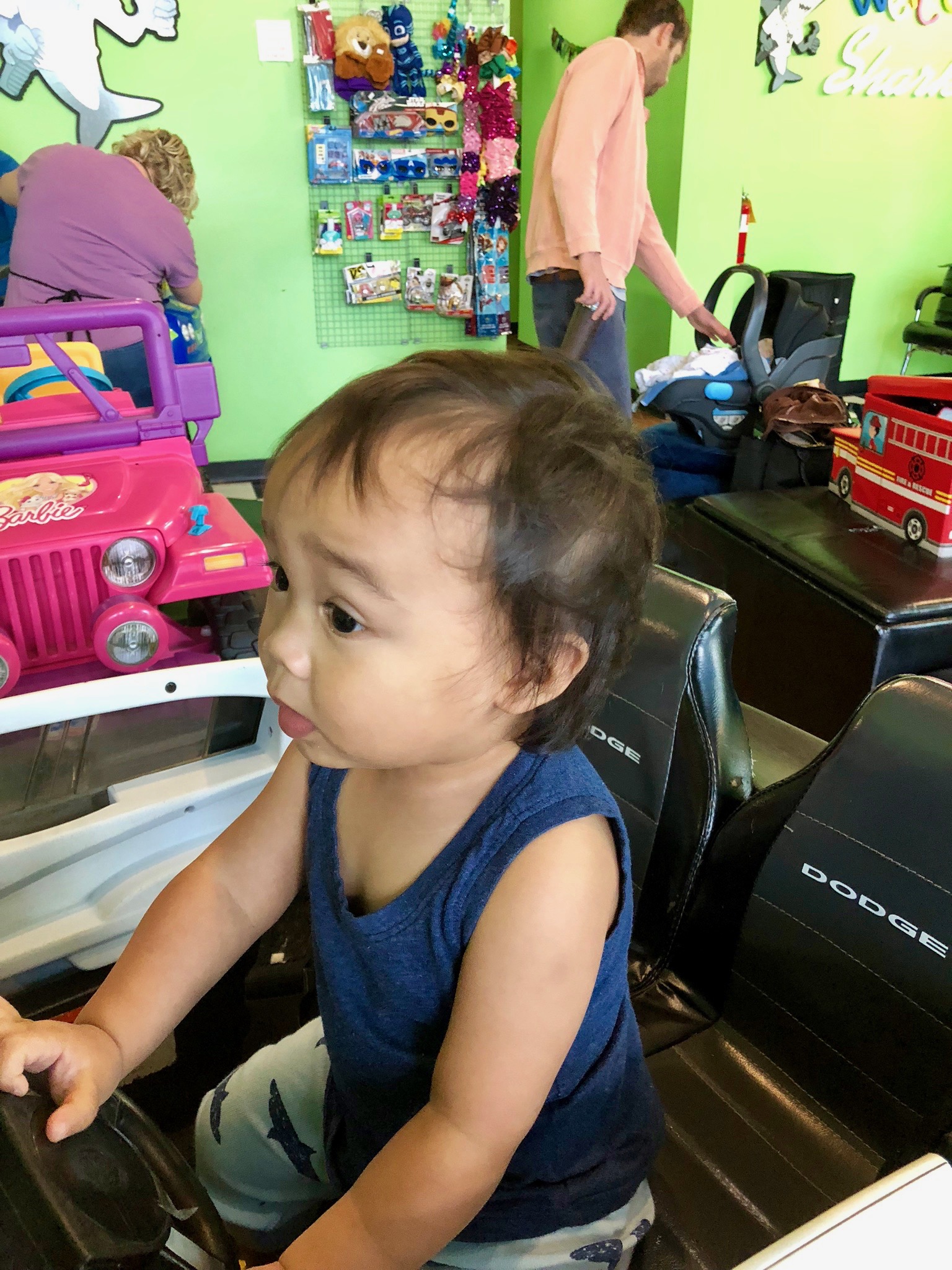 We visited Sharkey’s Cuts For Kids in Ballard, a hair salon that caters exclusively to children. They have little airplane and police cars chairs the kids sit in. Mickey Mouse and Thomas the Tank Engine are playing on the TVs. There are boxes filled with all sorts of random toys to keep kids preoccupied, and video games for the older kids.