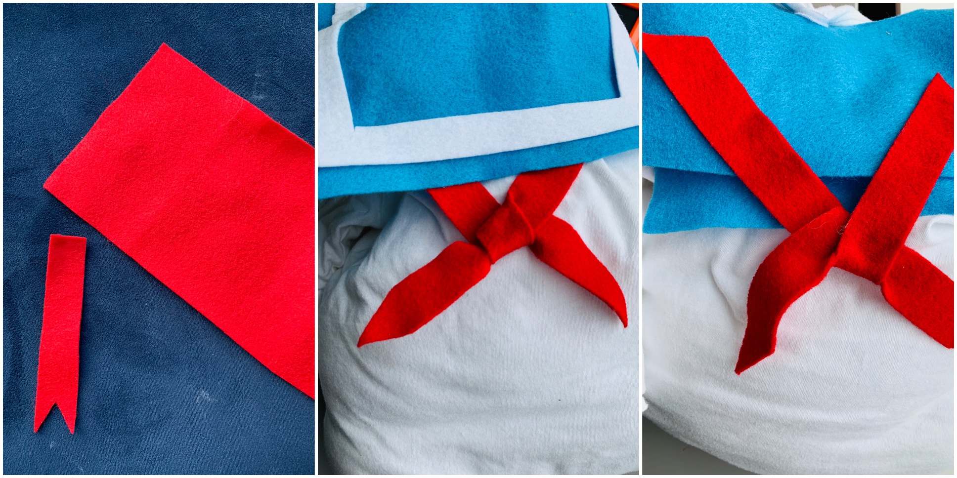Mr. Stay Puft has three key accessories – a bib, a scarf, and a hat. In this case, Avery’s size was an advantage, because I could make everything with standard 8×10 pieces of felt!