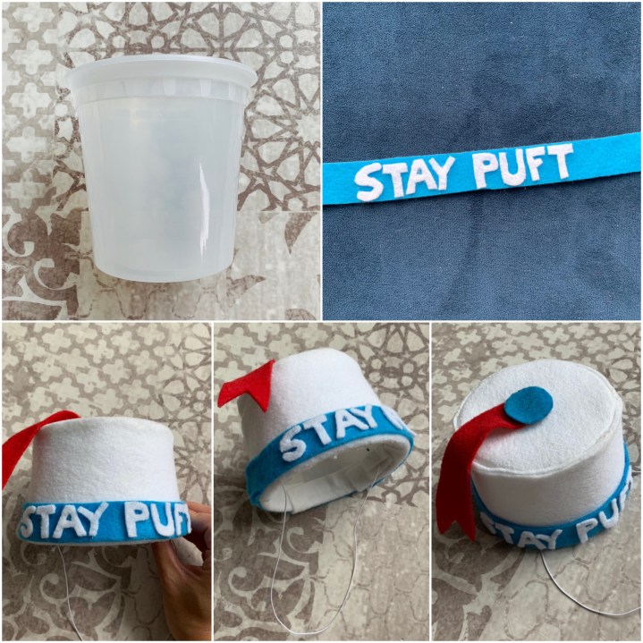For the hat, I started with a plastic container (the ones you get when you order take-out food) and cut the bottom off. I used white felt to cover the container. I cut a stripe of blue felt and also white ’STAY PUFT’ letterings and glue those together to be placed around the hat. Then I added a stripe of red felt and top that off with a blue round felt for the top of the hat. Last, I added white stretchy string so that it will stay on Avery’s head.