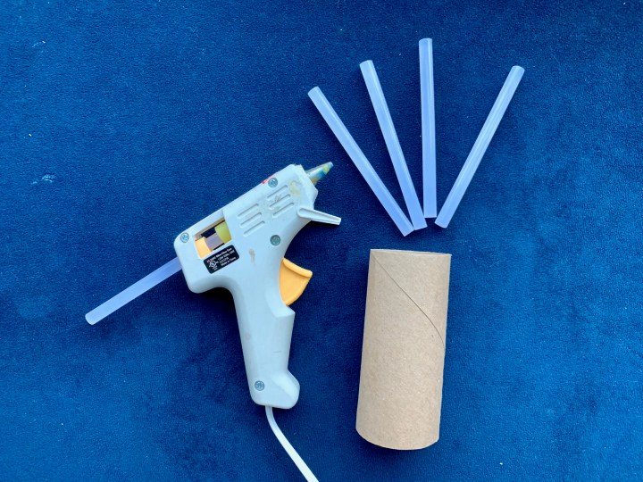 Cut out all your leaves from your felt using the template provided. Once everything is cut, it’s time to start gluing! Hot glue the four largest leaves around the cardboard tube, covering the entire tube.