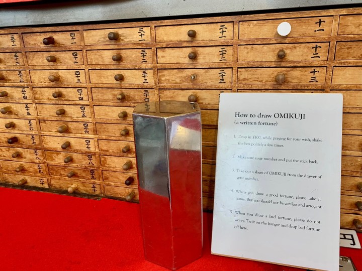 After shaking a box with wooden sticks, you can read a number from the stick and then find the matching wooden drawer, which hides a fortune message for you (some of them in the main temple building also include English messages, there will be a sign saying that, so fun to try!