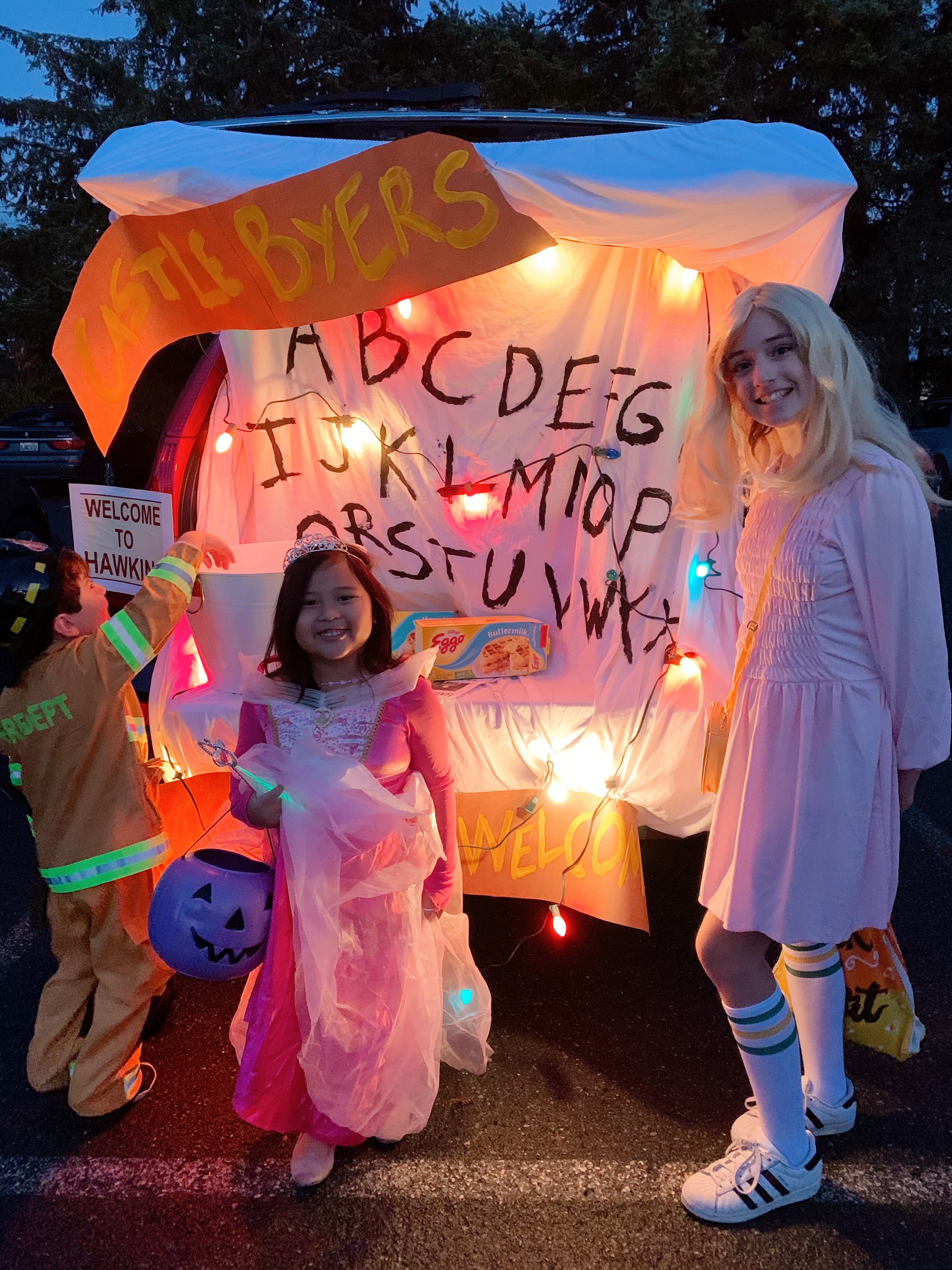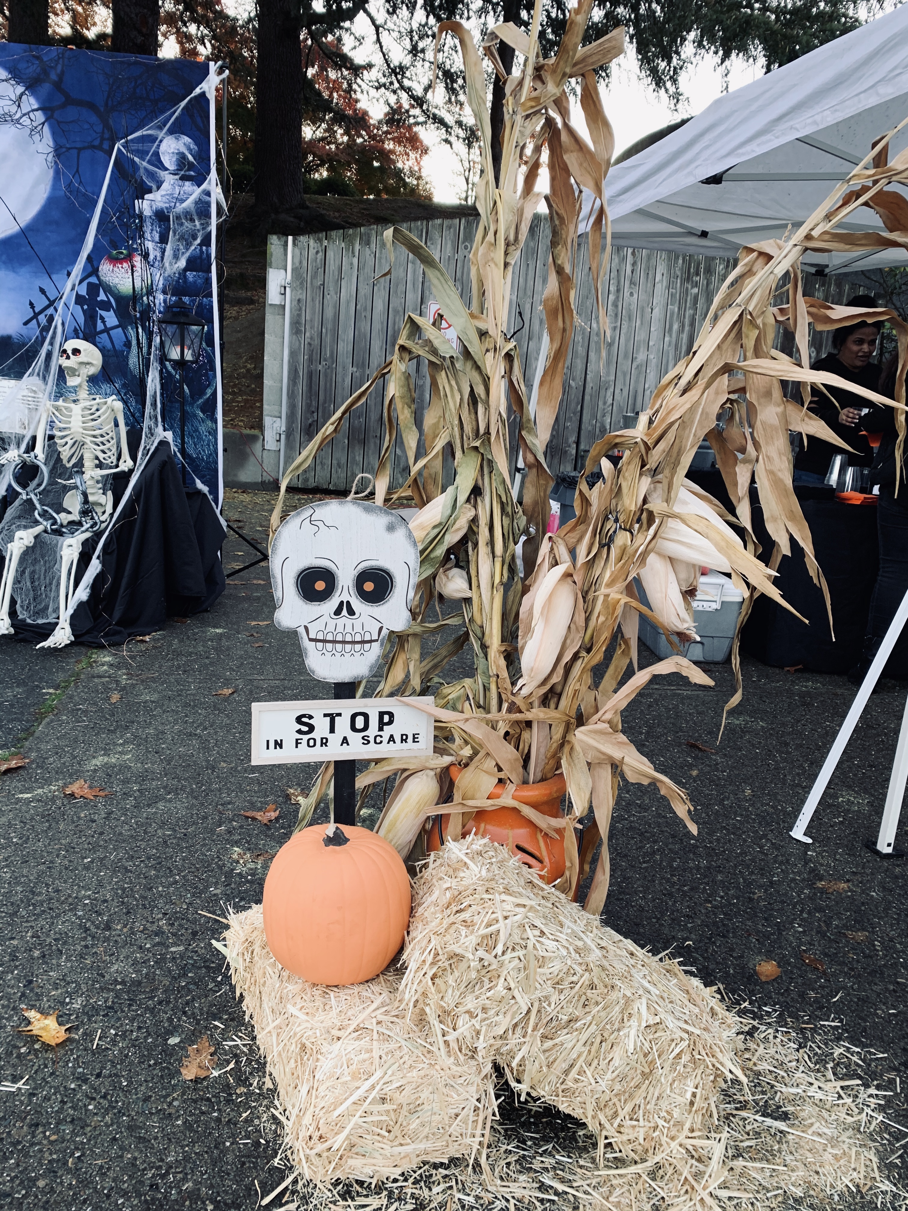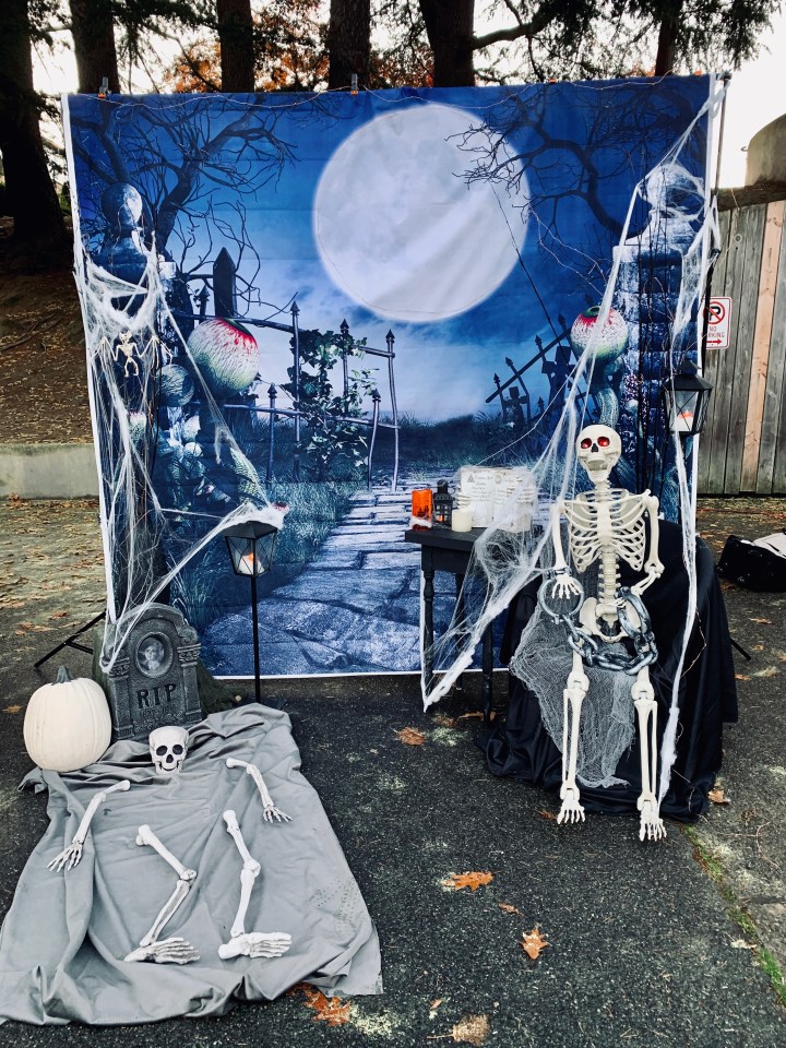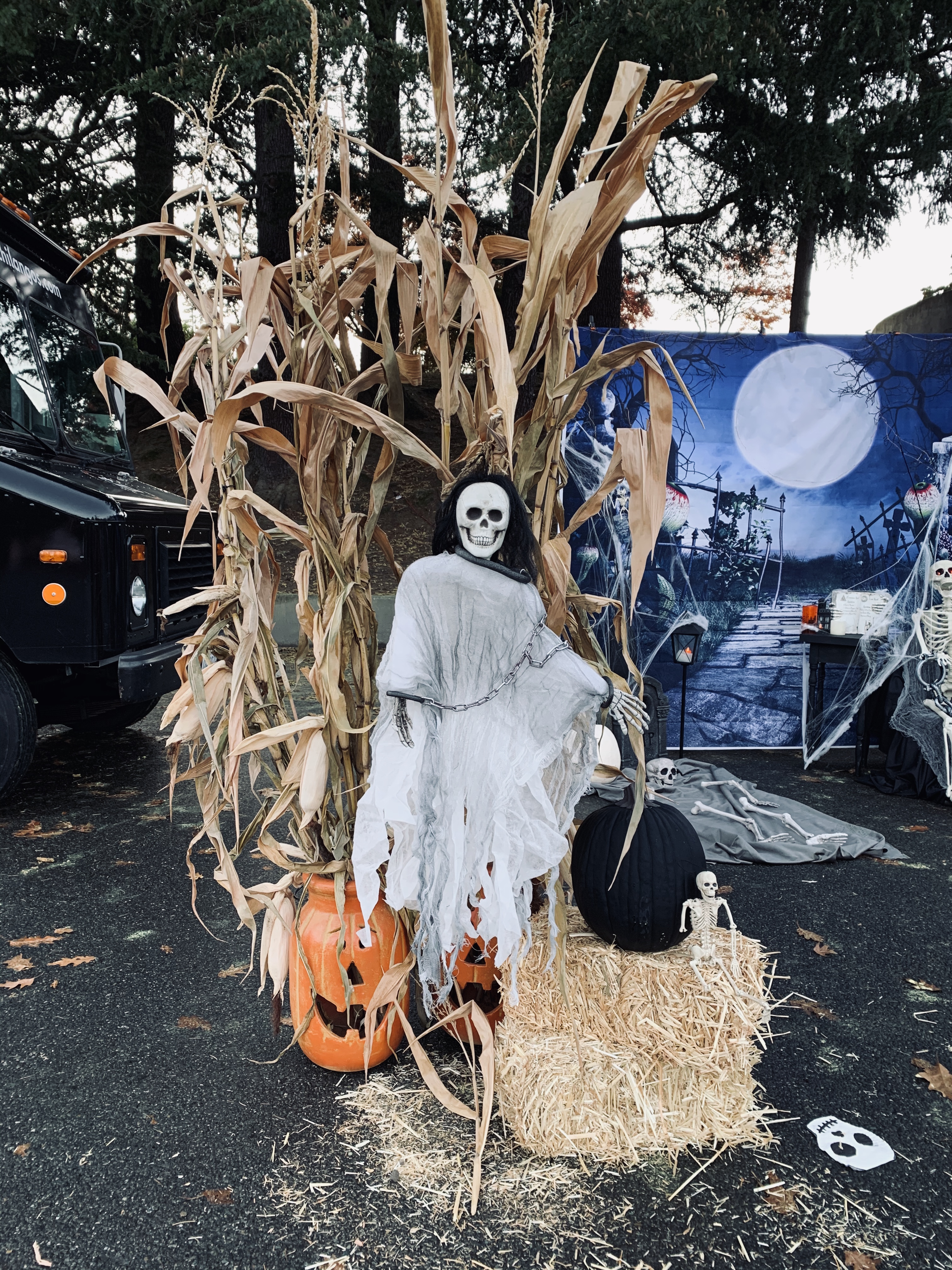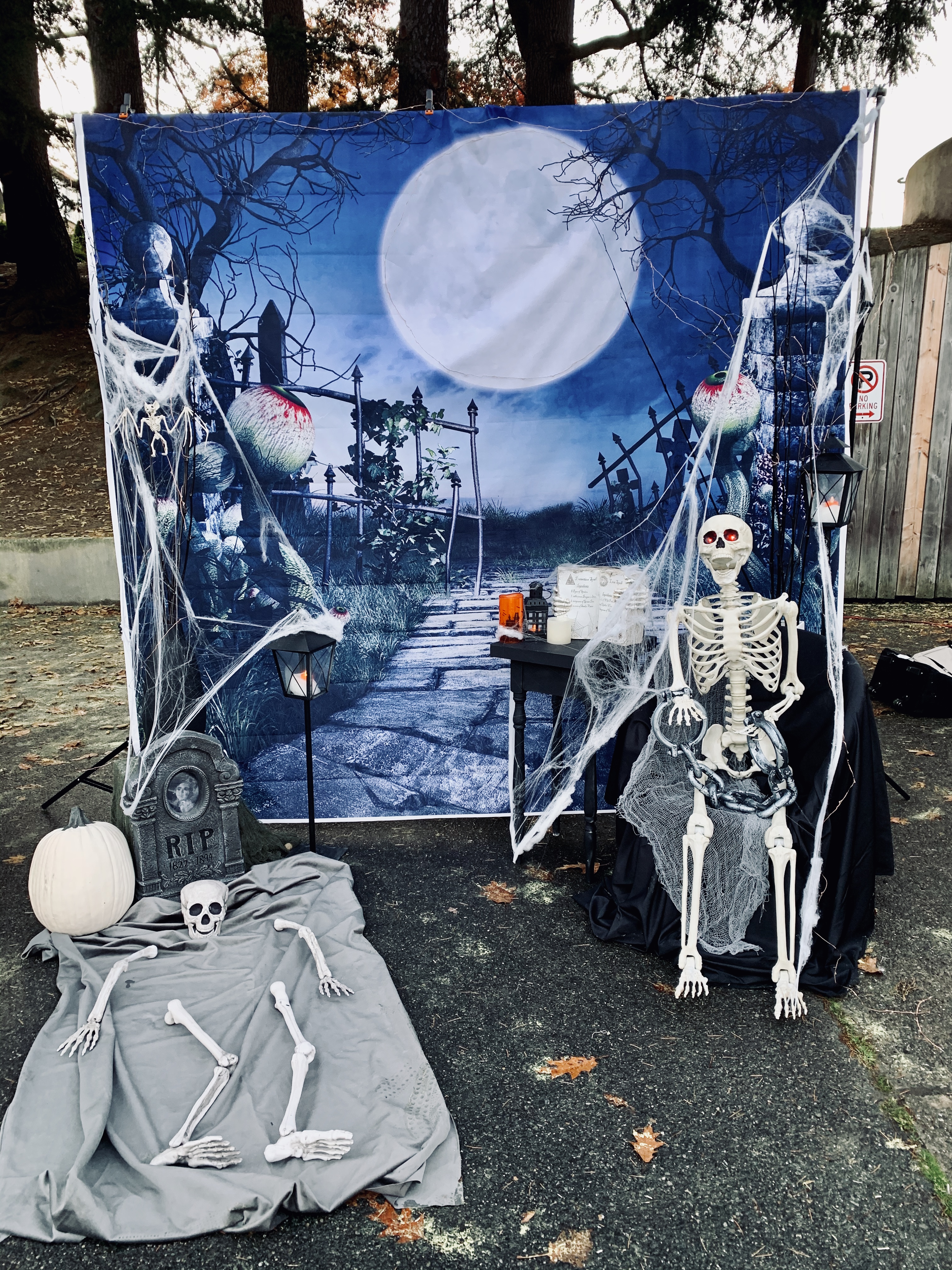 My party scene rental company, A Scene Come True was hired to help with setting up a backdrop for Sacred Heart School’s Trunk or Treat Event in Bellevue. It was our first time setting up for an Halloween event and we had such a spooktacular time using life size skeleton, tombstones, candlelights and all sorts of creepy monsters to make one heck of a backdrop!