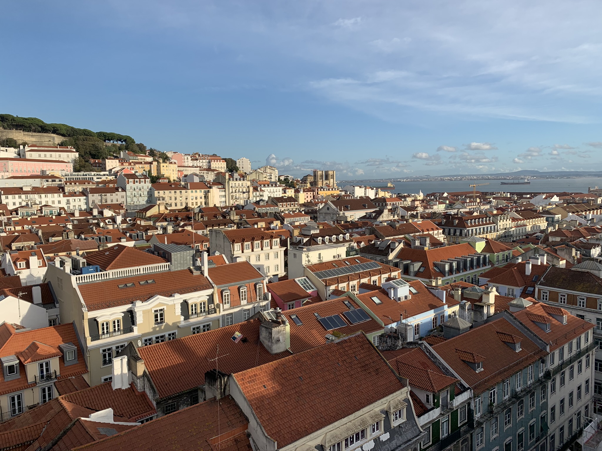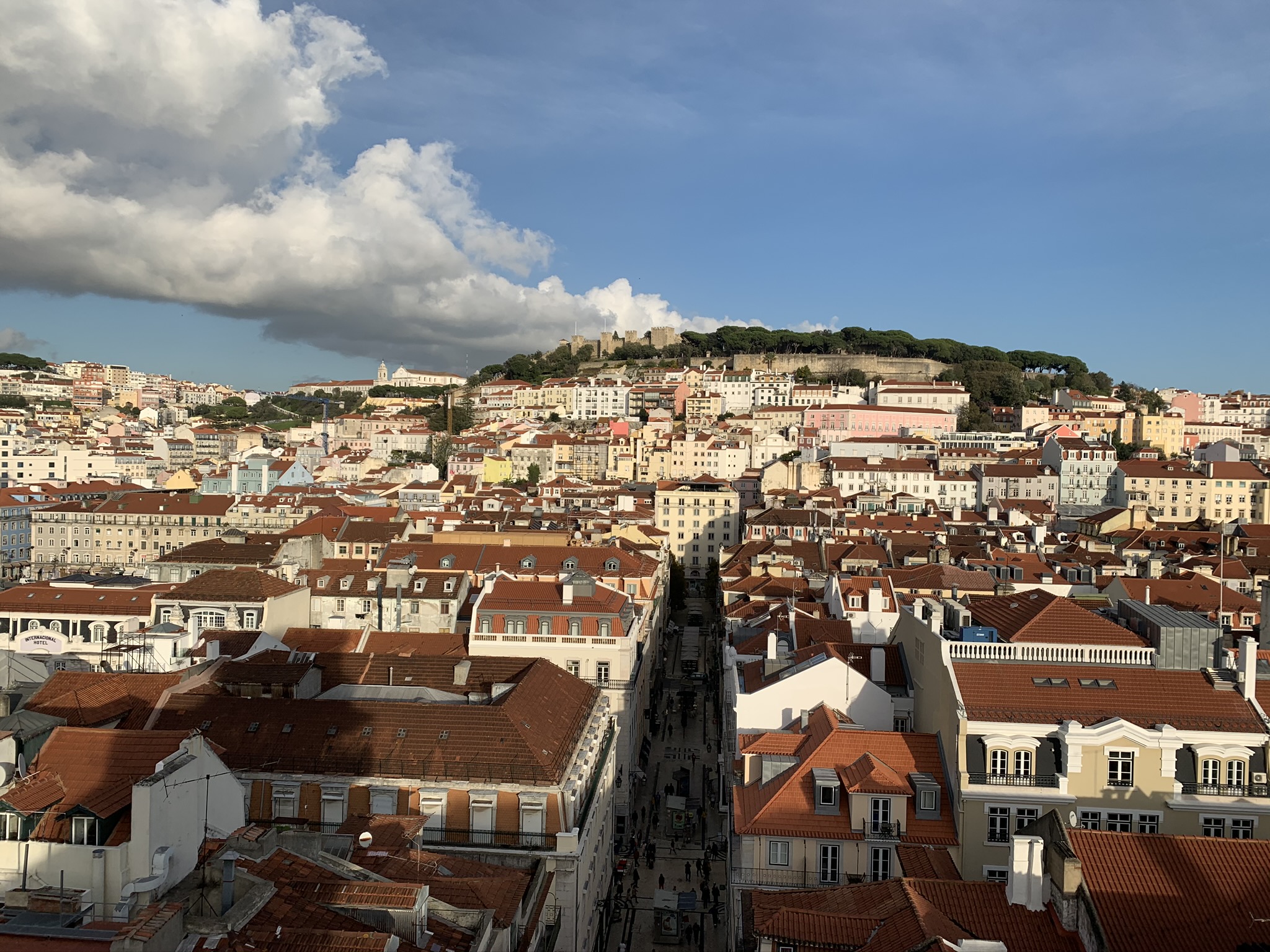 The view of Lisbon from the observation deck is beautiful. You can see the Carmo Convent ruins, São Jorge Castle, Rossio Square, Lisbon Cathedral, Rua Augusta Arch, Eduardo VII Park as well as across the Tagus River towards Cacilhas and beyond.